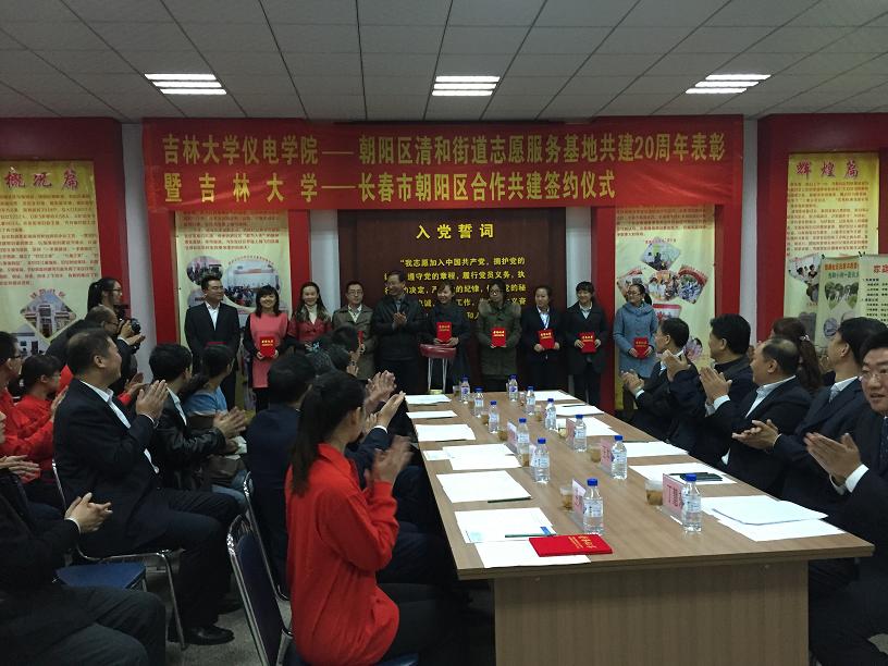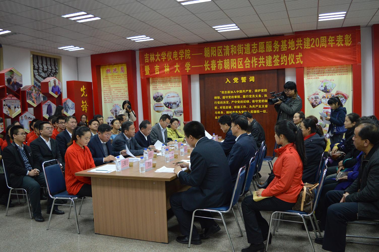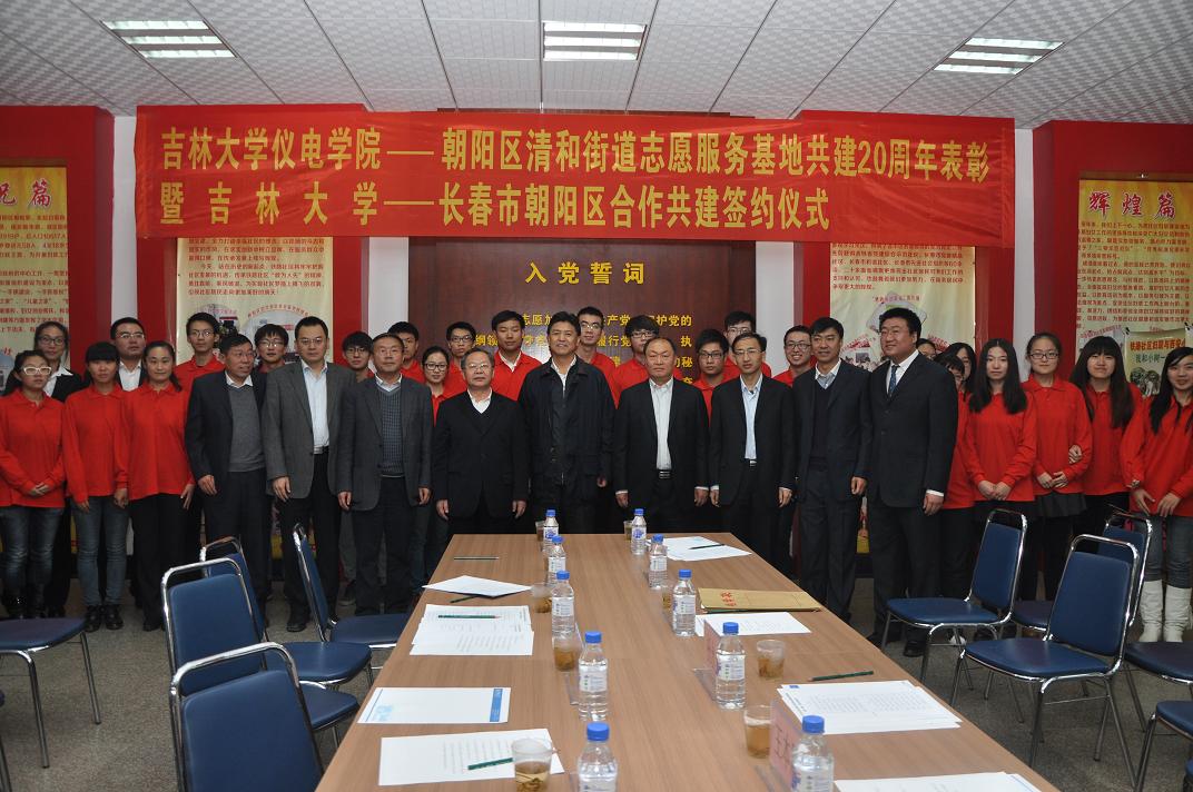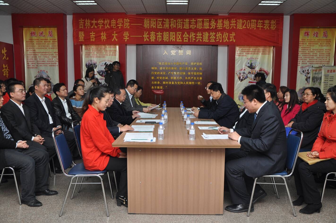 -长春市清和街道志愿服务基地共建20周年表彰暨吉林大学-朝阳区合作共建签约仪式在清和街道铁路社区党群活动室顺利举行。出席活动的的吉林大学领导有:校党委书记陈德文教授、党委副书记兼副校长韩晓峰教授、校团委书记姚毓春、仪器科学与电气工程香港六合彩开奖号码