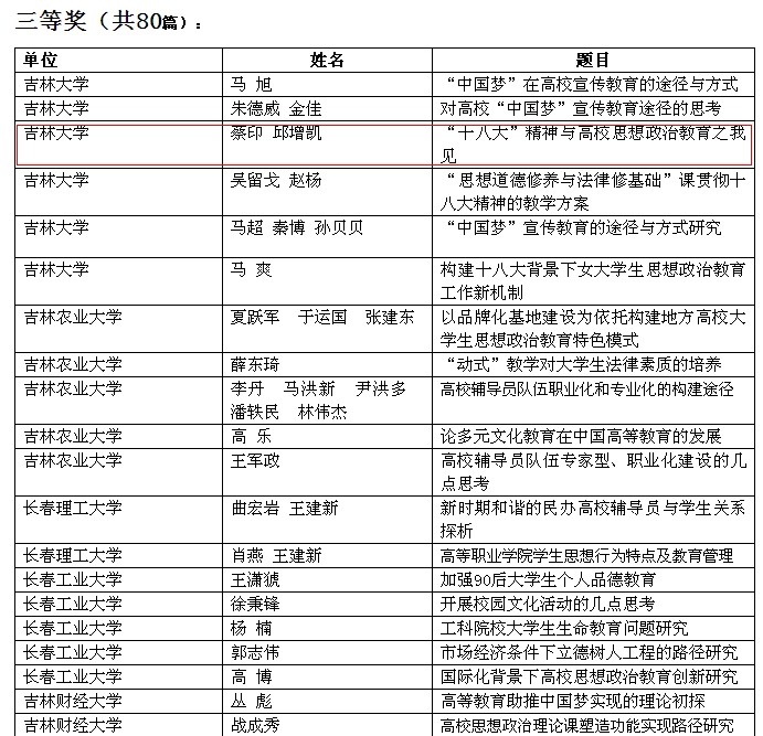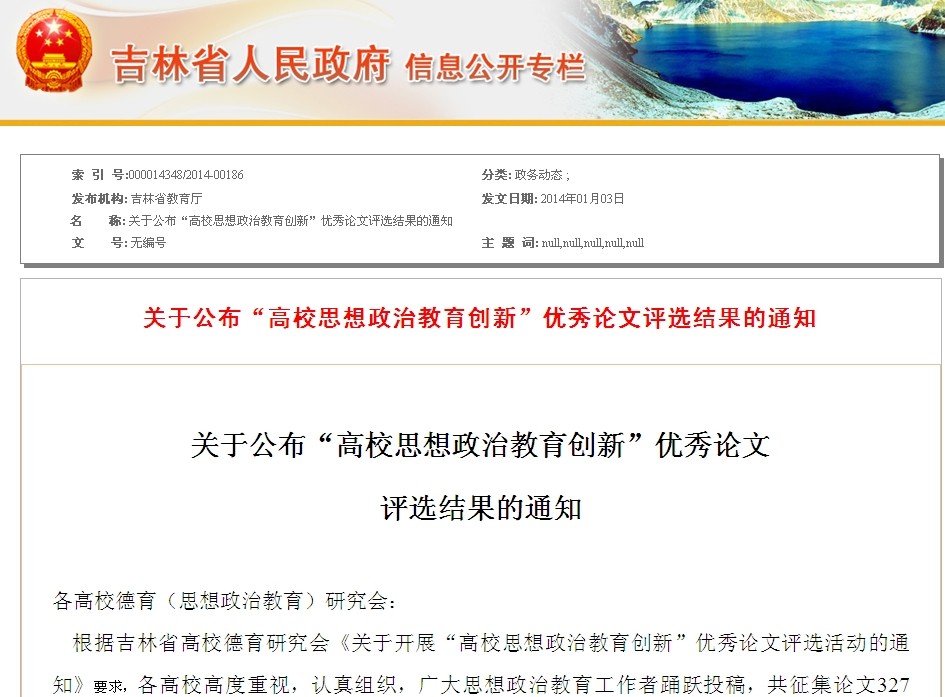 为深入学习贯彻党的十八大精神,进一步加强和改进大学生思想政治教育,推进思想政治教育学科建设与实践创新,全面提升香港六合彩开奖号码思想政治教育质量,吉林省教育厅、吉林省高校德育研究会联合举办了全省“高校思想政治教育创新”优秀论文评选活动。