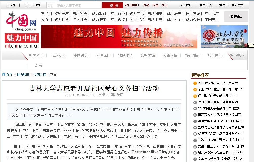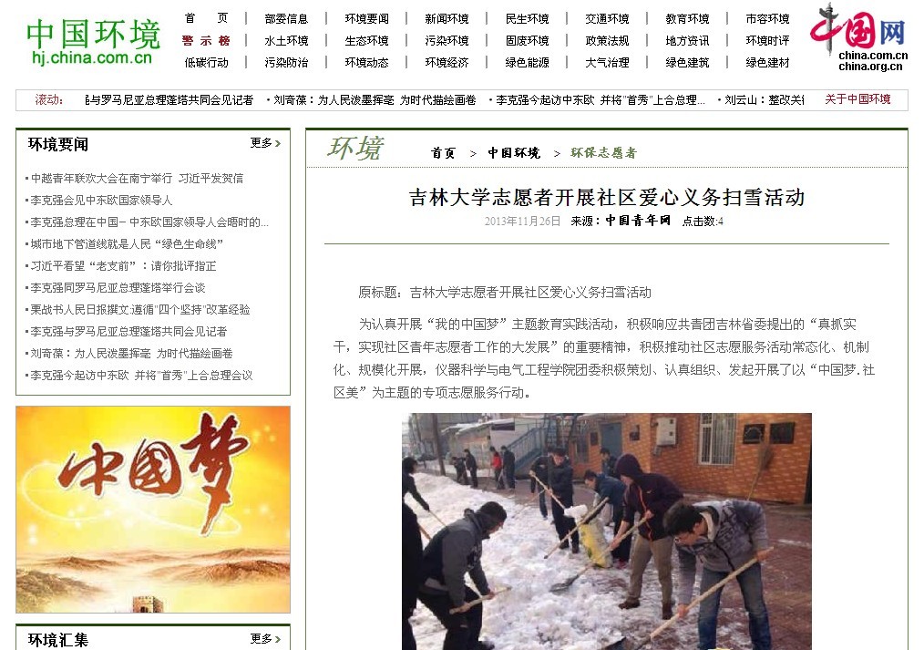 11月25日,中国青年网以《吉林大学志愿者开展社区爱心义务扫雪活动》为题对此次活动进行了详细报道,这是香港六合彩开奖号码