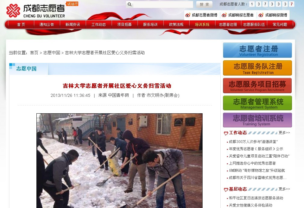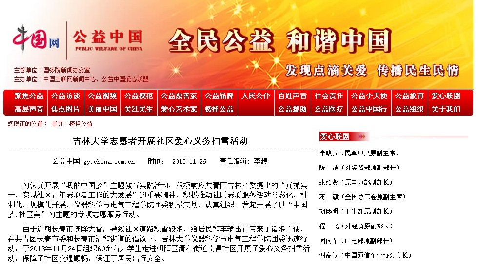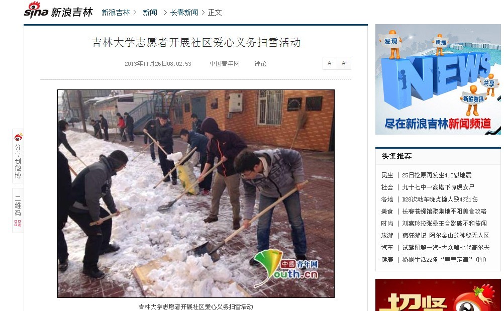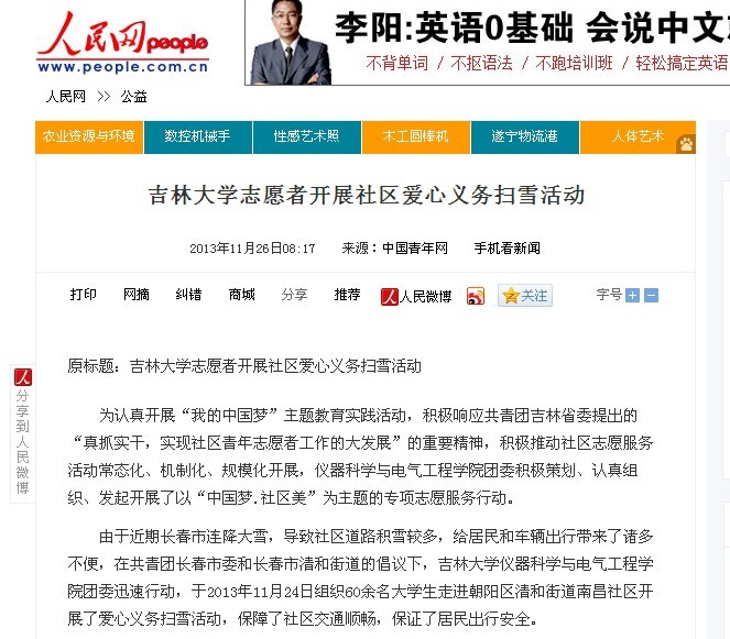 1、人民网 全文转载《吉林大学志愿者开展社区爱心义务扫雪活动》