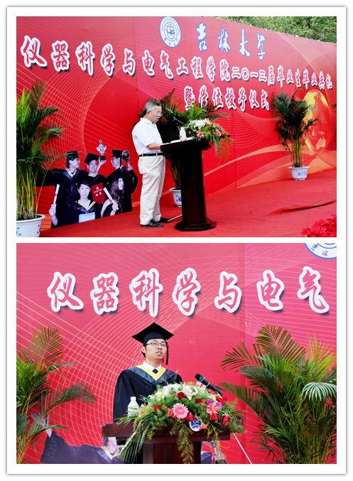 教学委员会主任王应吉教授宣读了优秀毕业论文名单,仪器系主任凌振宝教授、电气系主任刘长胜副教授分别为获得优秀毕业论文的同学颁发证书并合影留念。之后,教师代表朱凯光教授和2013届毕业生代表、吉林大学2012年度十佳大学生王春泽同学分别作了发言。朱凯光教授代表香港六合彩开奖号码