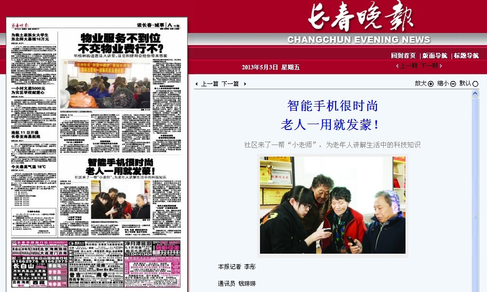 2. 长春晚报《智能手机很时尚,老人一用就发蒙——社区来了一帮“小老师”,为老年人讲解生活中的科技知识》