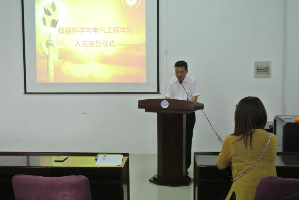 党委办公室主任刁庶带领全体党员面向党旗庄严宣誓。之后,研究生党支部新党员代表梁冰琪同学、入党积极分子代表周路佳同学分别做了发言。最后,院党委书记王爱民同志代表院党委做了深刻、精彩的讲话。王书记向全体学生党员提出了明确的要求,一是加强学习,不断提高理论水平和认知能力;二是积极工作,争取早日成为一名合格正式党员;三是知行统一、脚踏实地的做人做事。他希望同学们时刻严格要求自己,爱岗敬业,奉献进取,做一名组织放心、群众信赖的合格共产党员,以良好的精神状态,饱满的政治热情,以开拓进取、踏实敬业的工作作风,为实现中华民族获得伟大复兴中国梦贡献自己的一份力量,成为名副其实的共产党员。