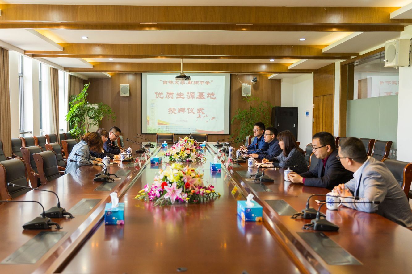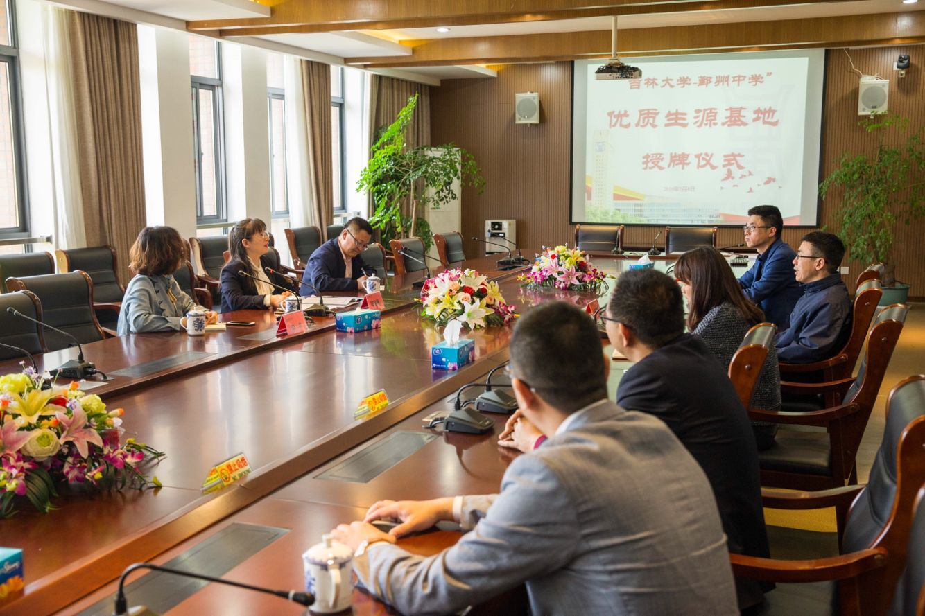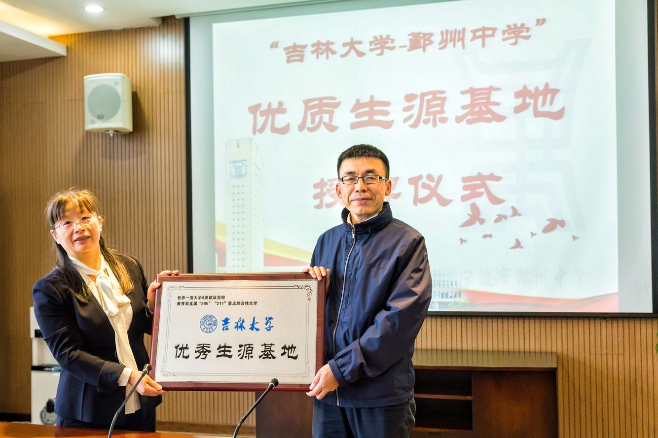 大类培养与交流、校内转专业、人才成长等工作,对鄞州中学的学生科创特色教育给予了充分肯定。随后,双方就招生宣传的节点、招生宣讲会、专家到中学做专题报告进行了交流。最后嵇艳鞠院长向王贤明校长授予了“吉林大学优秀生源基地”牌匾。