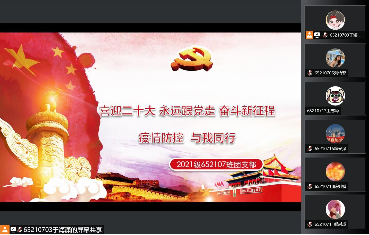 652107团支部于2022年4月13日10:00,线上开展了以《喜迎二十大、永远跟党走、奋斗新征程》为主题的团日活动。本次活动由团支部书记于海潇主持,支部全体同学参与了本次活动。