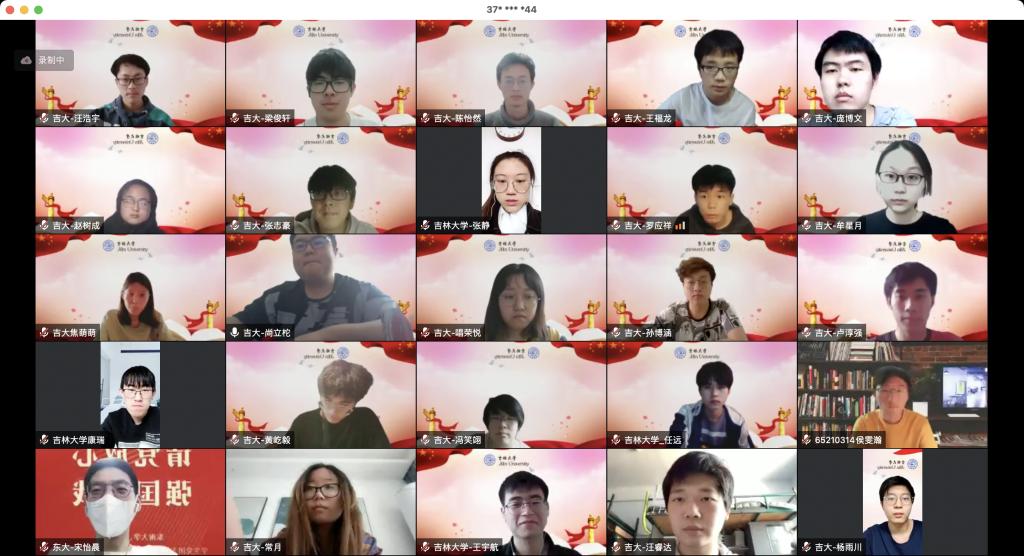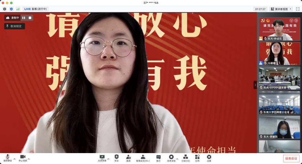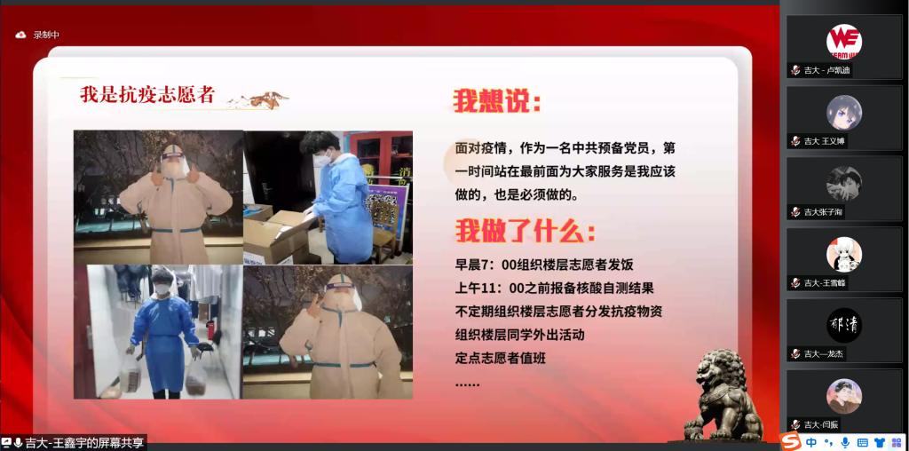 抗疫志愿者代表分享广大师生在抗疫过程中的先进事迹和宝贵经验。郝毅、王鑫宇、赵梦珂、胡玮桐同学分别从个人和集体两个角度出发,分享了在校园封闭管理期间的抗疫日记和志愿服务经历,吉大学子守望相助、封校不停学,学生党员积极投身防疫一线,践行着新时代青年的初心与使命。听完吉林大学同学的分享,东南大学党团支部学生代表分享他们的抗疫事迹。精彩的发言与分享让与会的同学们再一次感受到了战“疫”之下青年人的奋斗与担当。围绕会议主题,参会同学展开了热烈的讨论,学生代表纷纷表示中国共青团成立100周年是历史性的一刻,青年一辈是时代的见证者,也是时代的参与者,要牢记使命,努力奋斗,回报祖国。