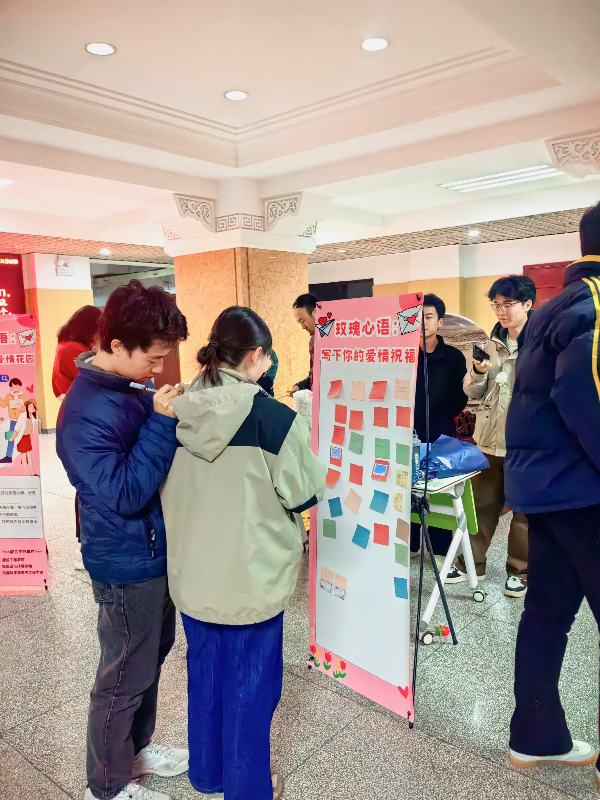 随后,同学们在美丽的玫瑰花旁,写下对爱的理解与祝福,并将其挂在活动现场的“爱情祝福展板”上。现场氛围温馨而感人,大家纷纷表示,希望在未来能够更好地理解自己和他人,将弗洛伊德的爱情观运用到日常生活中。