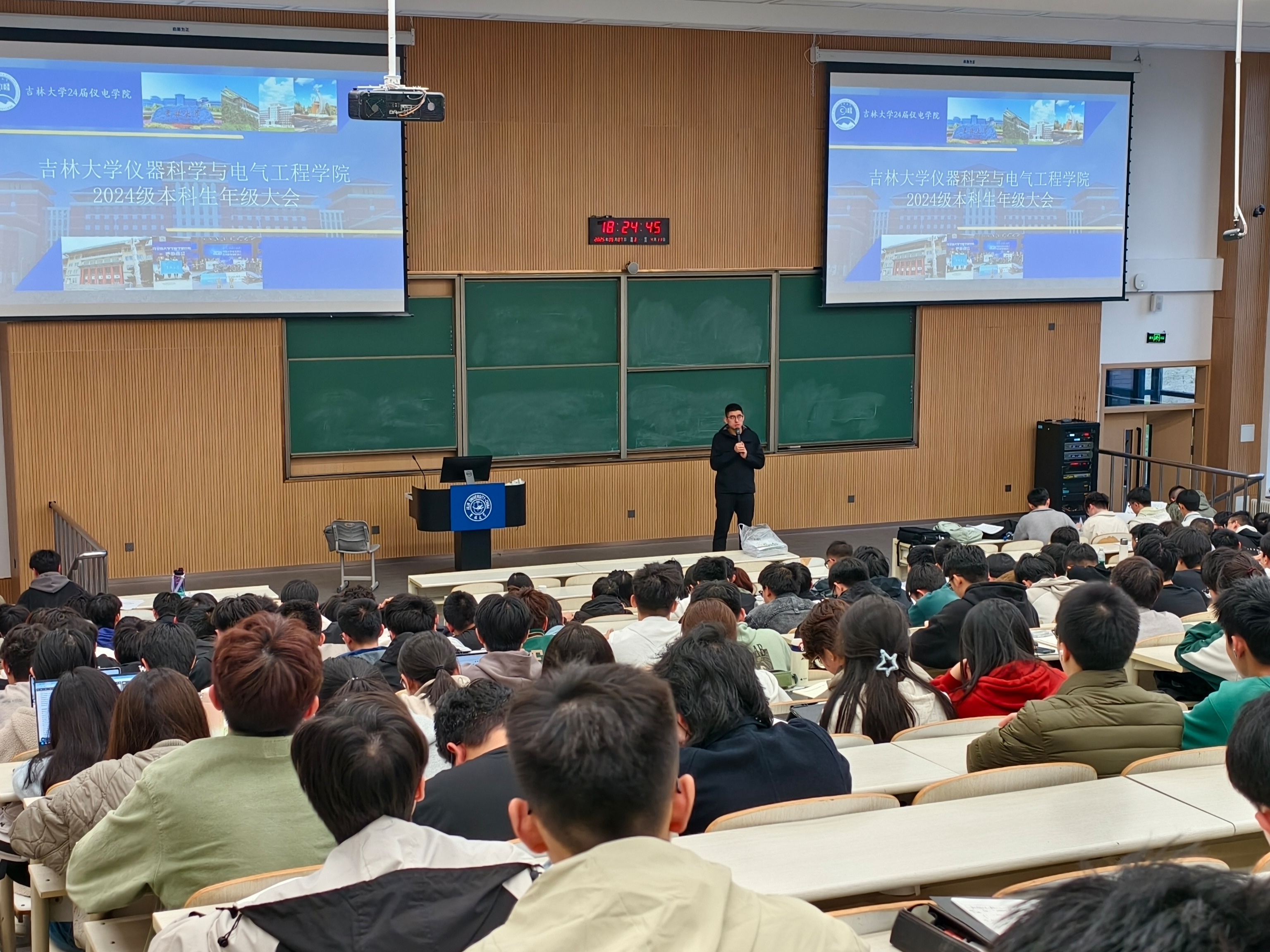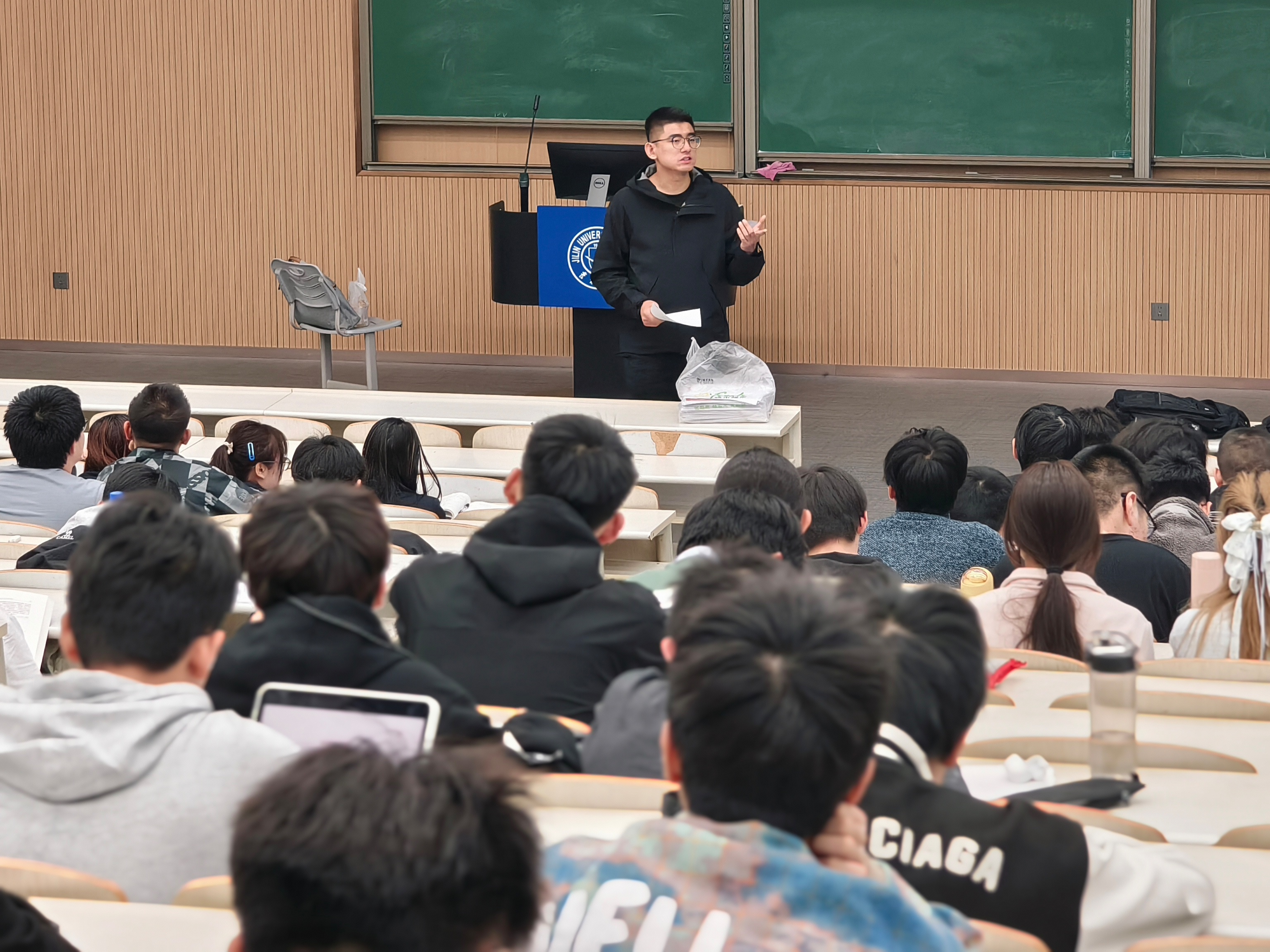 2024级辅导员王文轩在李四光教学楼第二阶梯教室召开2024级学生年级大会,2024级全体学生参会。