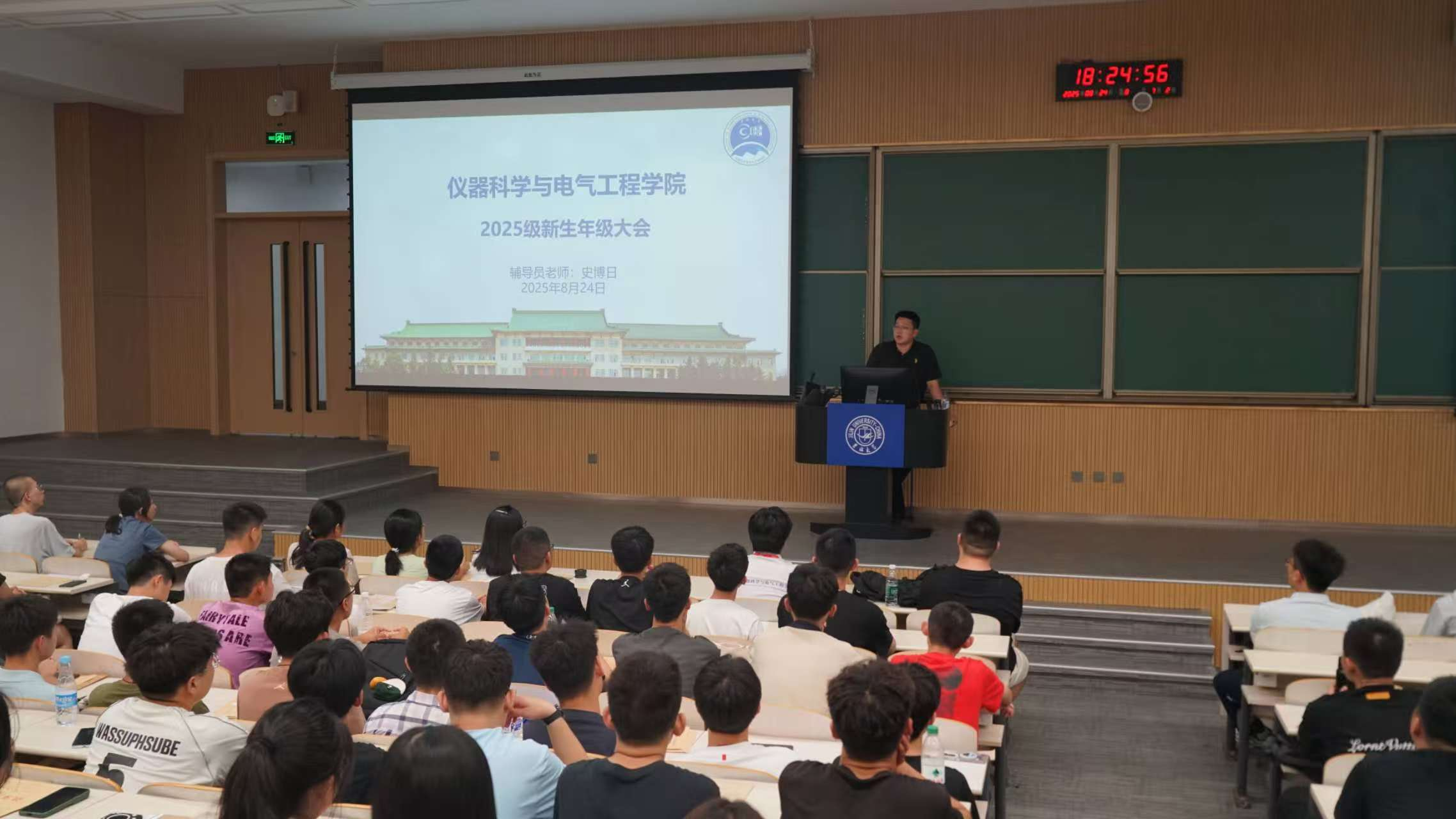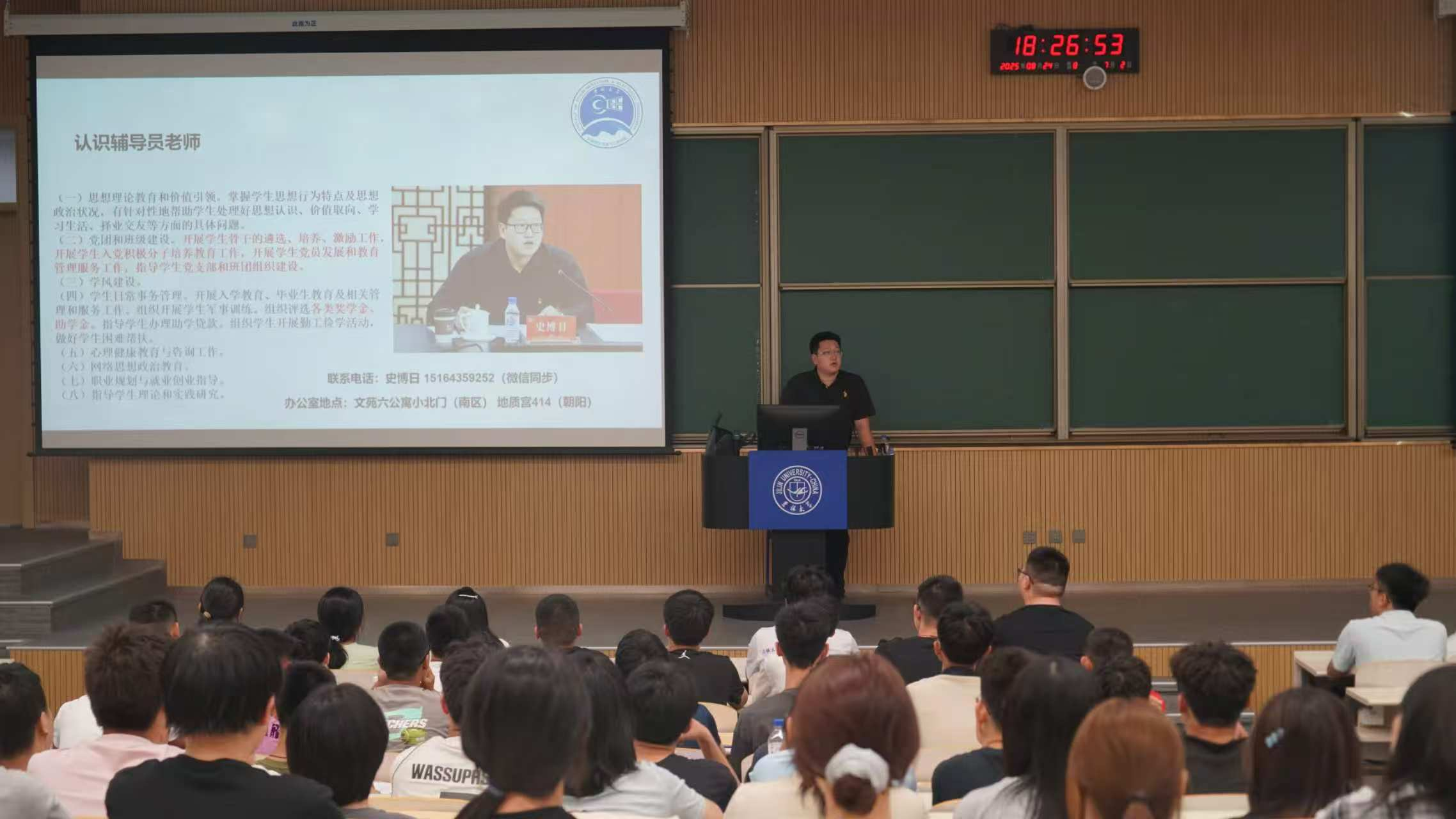 2025级辅导员史博日老师在李四光楼主持召开新生第一次年级大会,全体2025级新生参会。