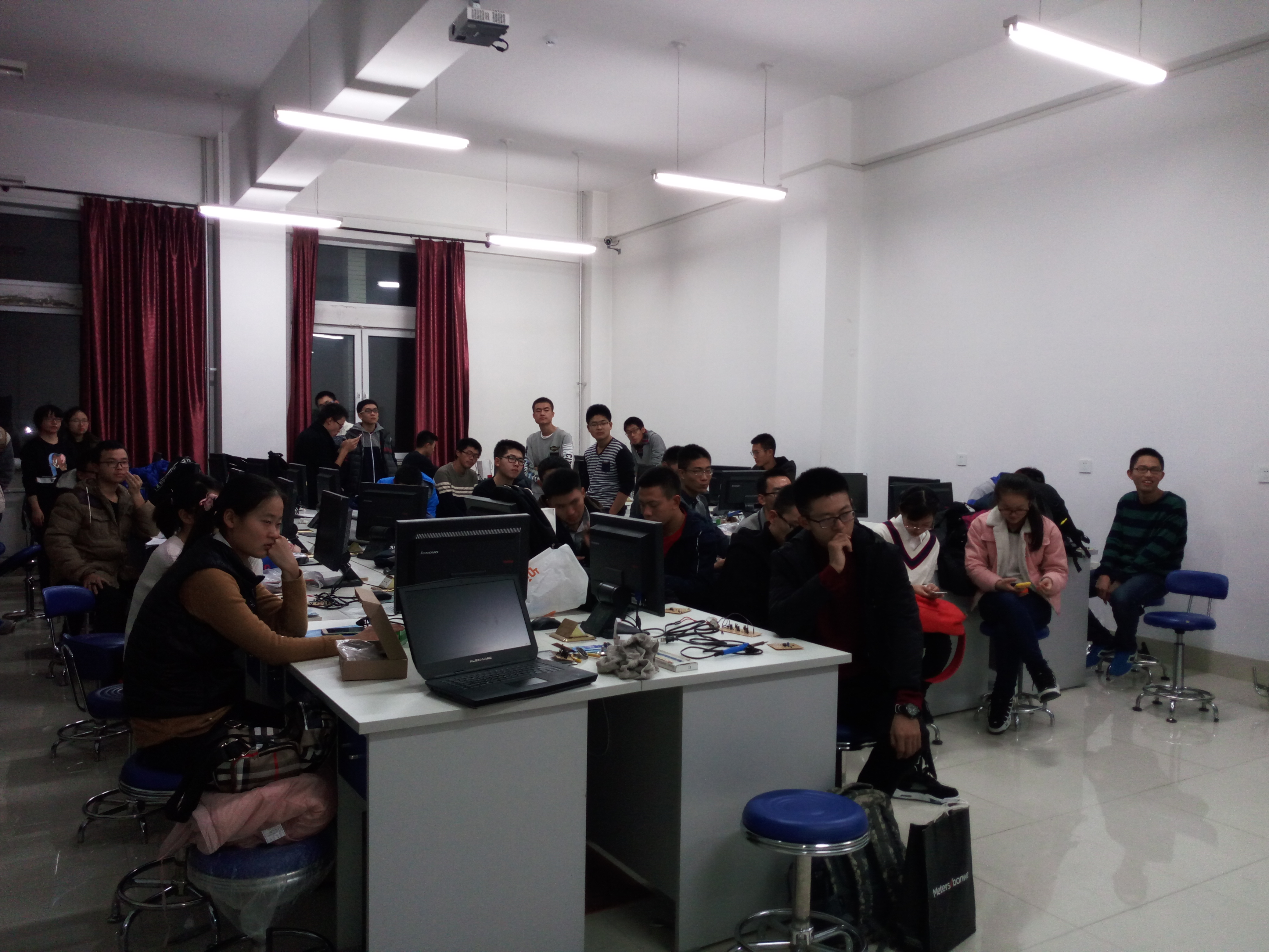 此次培训内容为报警指示灯电路的原理剖析以及上一期培训作品验收。培训开始,15级主讲人向参加培训的同学介绍了本次培训所焊接的电路——报警指示灯,并且详细地解剖了该电路的运行原理。之后,主讲人又向在场的16级同学提出了本次电路焊接的几点要求以及焊接过程中的注意事项。在大家对指示灯电路充分理解后,15级科协成员开始对上期作品进行检查。期间,15级科协成员还对16级成员进行拓展性提问,与同学们亲密互动,和同学们一起探索电路设计问题,使同学们对理论与实践的结合有了更多更丰富的想法,通过细心地解决同学们对理论知识和焊接的电路问题,使每一名同学都从中收获了经验和知识。本期培训最终在大家的热情讨论中结束。
