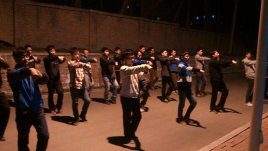 紧张有序的训练于18:30拉开序幕,每次训练主要分三部分进行。第一部分是由大三专业练习太极拳多年的学长对全体同学进行动作指导,叙述动作要领,让大家对拳法步调有一个大体的了解。第二部分则是分小组各自进行练习,分别由一位同学来对大家进行动作纠正和细节上的完善。第三部分由学长带领同学们跟随音乐完整地进行几次太极拳整套动作的练习,并在练习中不断完善动作要领。每次训练持续了一个多小时,但同学们的热情却丝毫没有退减。每一次抬手,每一次曲腿,每一次转身,每一次出拳,他们都仔细琢磨,反复练习,力求做到精准到位。他们专注的眼神和认真的态度,充分显示了其对于本次训练的重视。