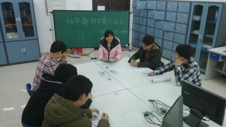 第九届学生会秘书部于2014年3月 10日12:20在中心校区李四光实验楼402室举行了新学期工作交流会,学生会秘书部全体成员参加了此次会议。