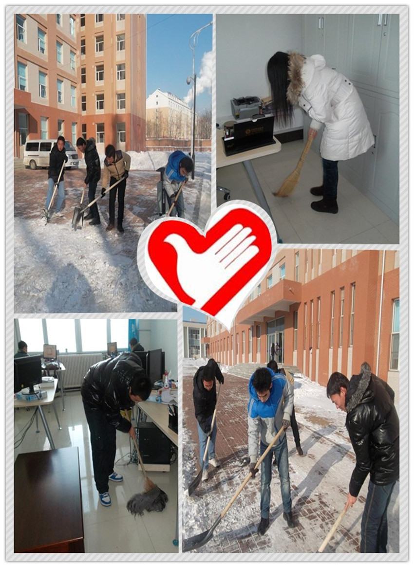 配备的除雪工具仅仅是几把铁锹,加上五六级的寒风和零下二十度的寒冷气温,使除雪工作更加艰难。一开始,志愿者们脸和手脚都冻得通红,嘴里呼出的热气一下子就凝成了水雾,可是大家仍发扬吃苦耐劳、顽强拼搏的精神,团结协作,顶着寒风,咬牙坚持,将宿舍楼和教学楼外的积雪清扫干净。他们热火朝天、干劲十足的扫雪身影也感染了路过的同学,大家纷纷表示赞许。经过一个小时的奋战,此次扫雪任务圆满完成,虽然室外气温很低,但是大家劳动的热情,团结的力量让这个冬日变得格外灿烂和温暖。与此同时,志愿服务部2012级两名同学准时来到李四光楼203辅导员办公室,帮助新生辅导员蔡印老师打扫办公室。他们两位合理分工,埋头苦干,拿起抹布、笤帚等清洁工具对办公室的门窗、地面、桌椅、墙角等卫生死角进行了全面彻底的打扫和清理,活动过程中,他们不怕苦、不怕累,经过一个小时的劳动,顺利完成了大扫除任务,使办公室整洁卫生、焕然一新,两位同学的辛勤劳动也获得了大一导员蔡印老师的高度认可和鼓励。