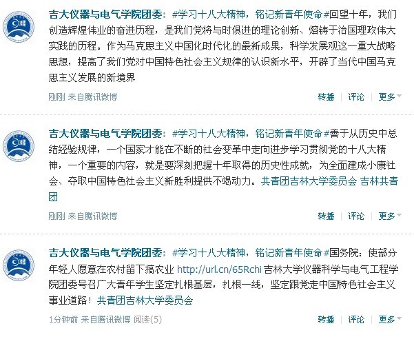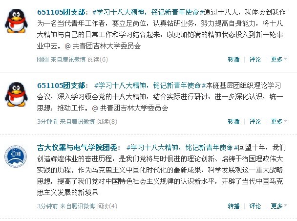 团委号召各班级团支部要高度重视并把学习宣传贯彻党的十八大精神作为当前和今后一个时期的首要政治任务,把这项工作摆在突出位置,集中力量,抓好落实,大力创新活动形式和载体,力求贴近学生的思维方式和认知习惯,不断积极创新总结,扎实推进微博学议十八大活动,不断掀起学习宣传贯彻十八大精神的新高潮!