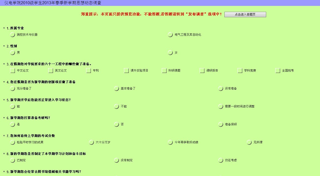认真开展2013年寒假返校学生思想状况调查工作,具体工作内容如下:(一)各年级辅导员老师在3月3日(周日)晚深入宿舍、走访看望返校学生,与同学们交流假期见闻、社会实践活动收获等,深入了解同学们对时事形势、社会关注焦点问题等的看法和态度,并对学生的人身、财产安全进行了教育,提醒各年级同学注意防火防盗,确保学生公寓稳定。(二)开展返校学生思想动态网上问卷调查工作,2010级同学自发组织本年级学生在网上进行调查问卷,针对全国“两会”、读研就业、新学期计划、香港六合彩开奖号码