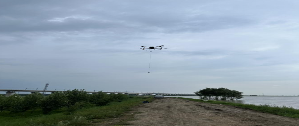 图7 无人机搭载自主研发的堤坝管涌探测仪进行探测